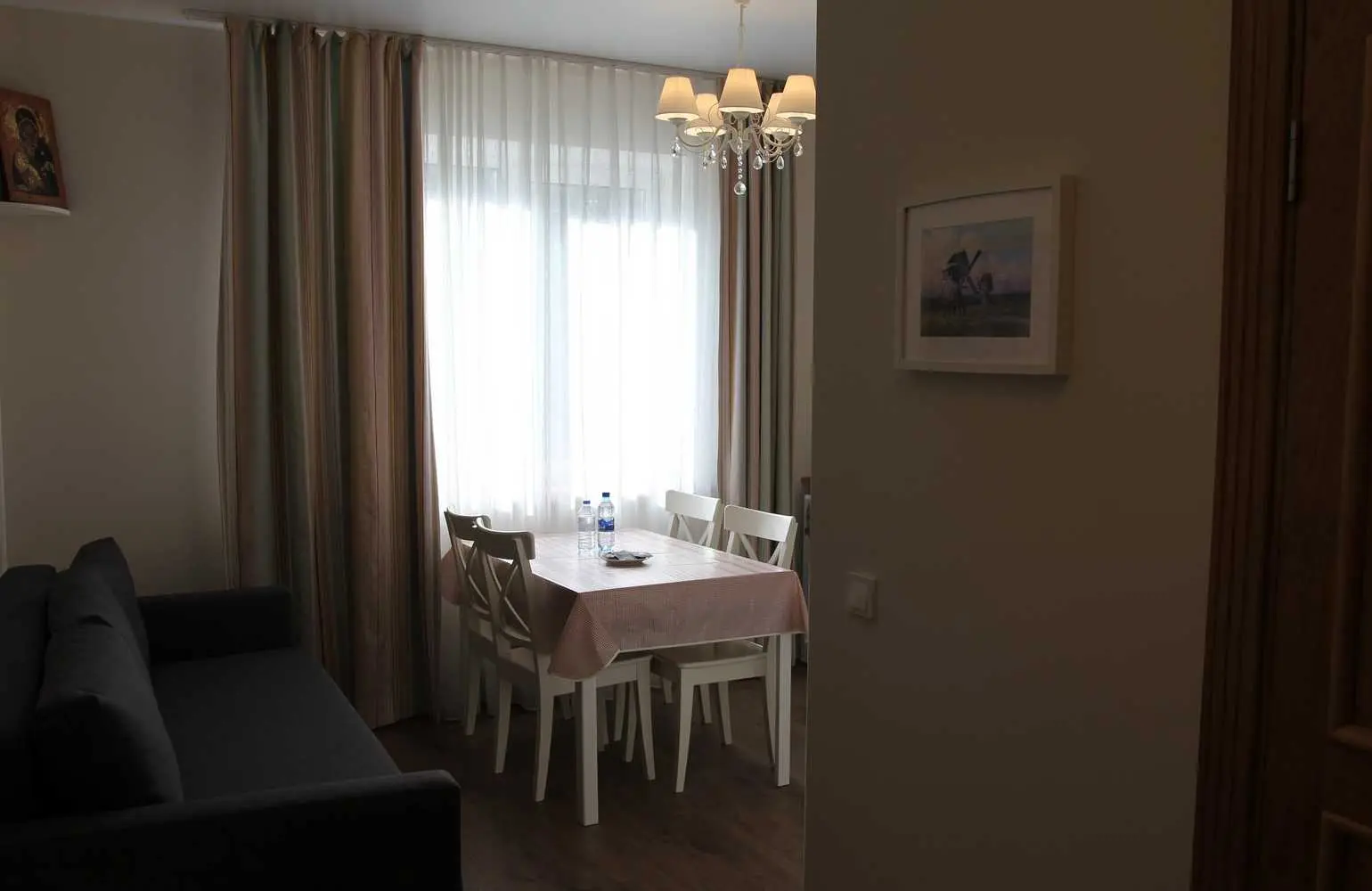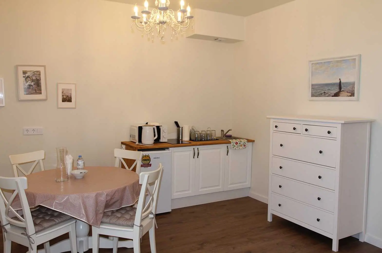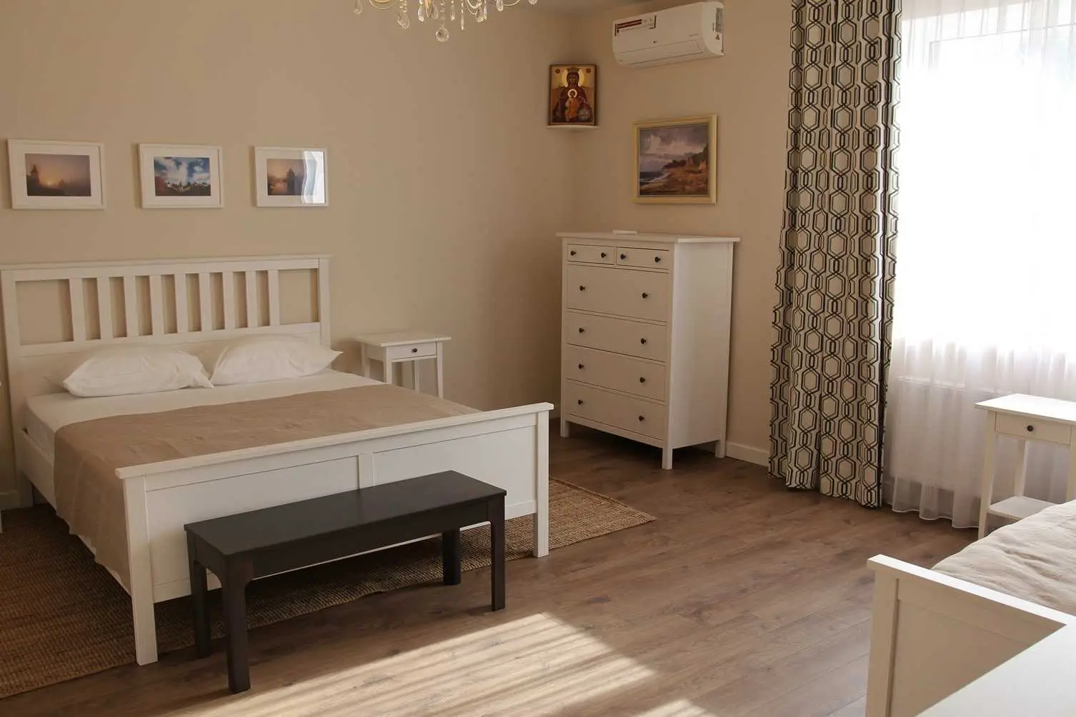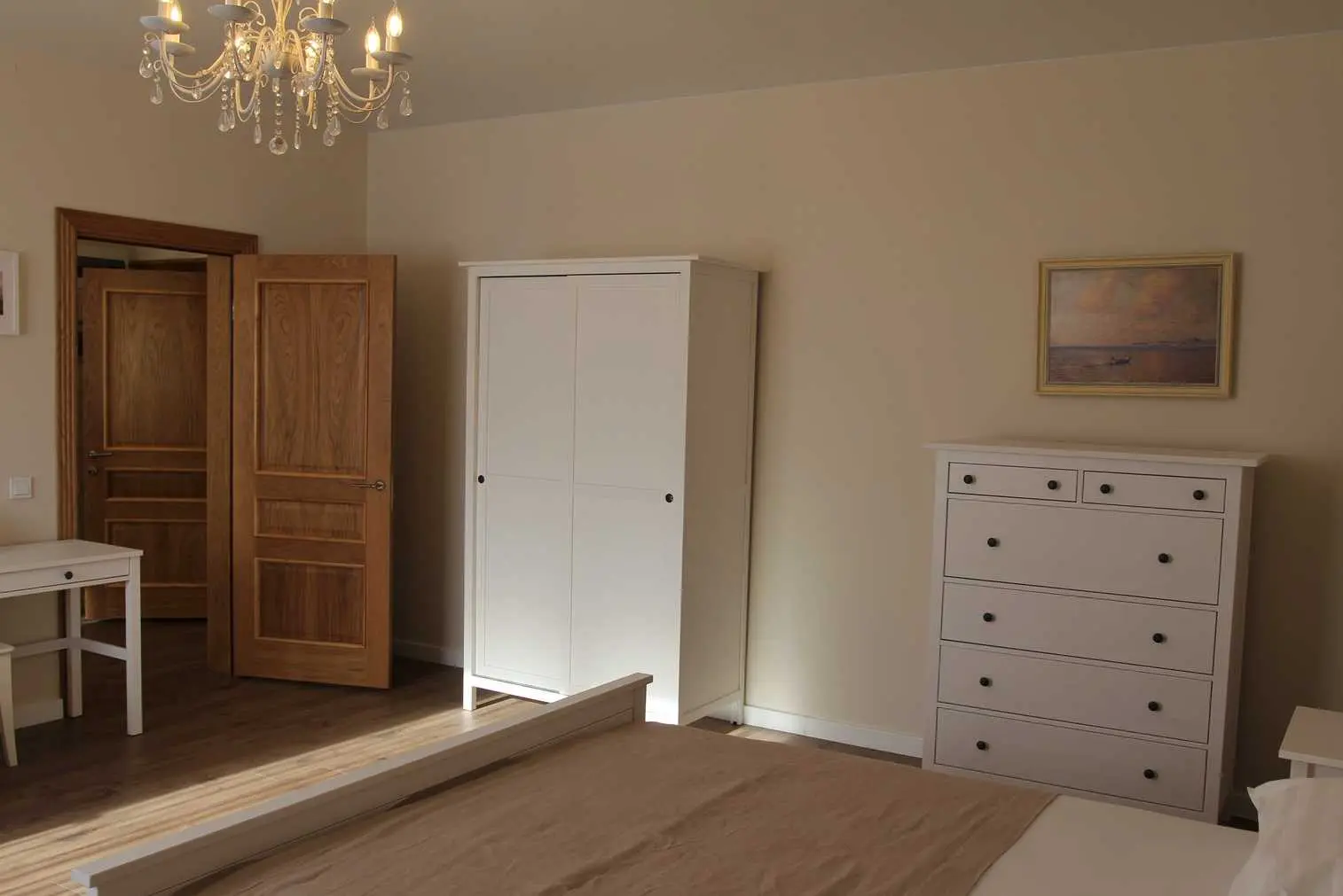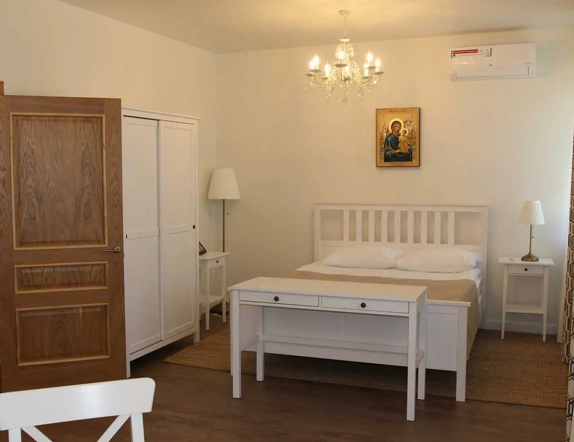 Номер расположен на втором этаже и состоит из прихожей, спальной, санузла с душем и кухни. В спальной комнате расположена двухместная кровать с прикроватными тумбочками, комод, торшер, туалетный столик и платяной шкаф.