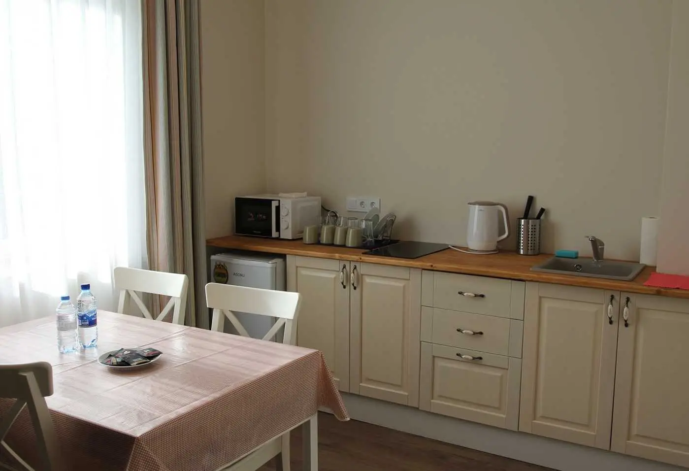 На кухне находится обеденный стол со стульями, кухонный гарнитур, вся необходимая посуда и бытовая техника: микроволновая печь, электрическая плита, чайник и холодильник.